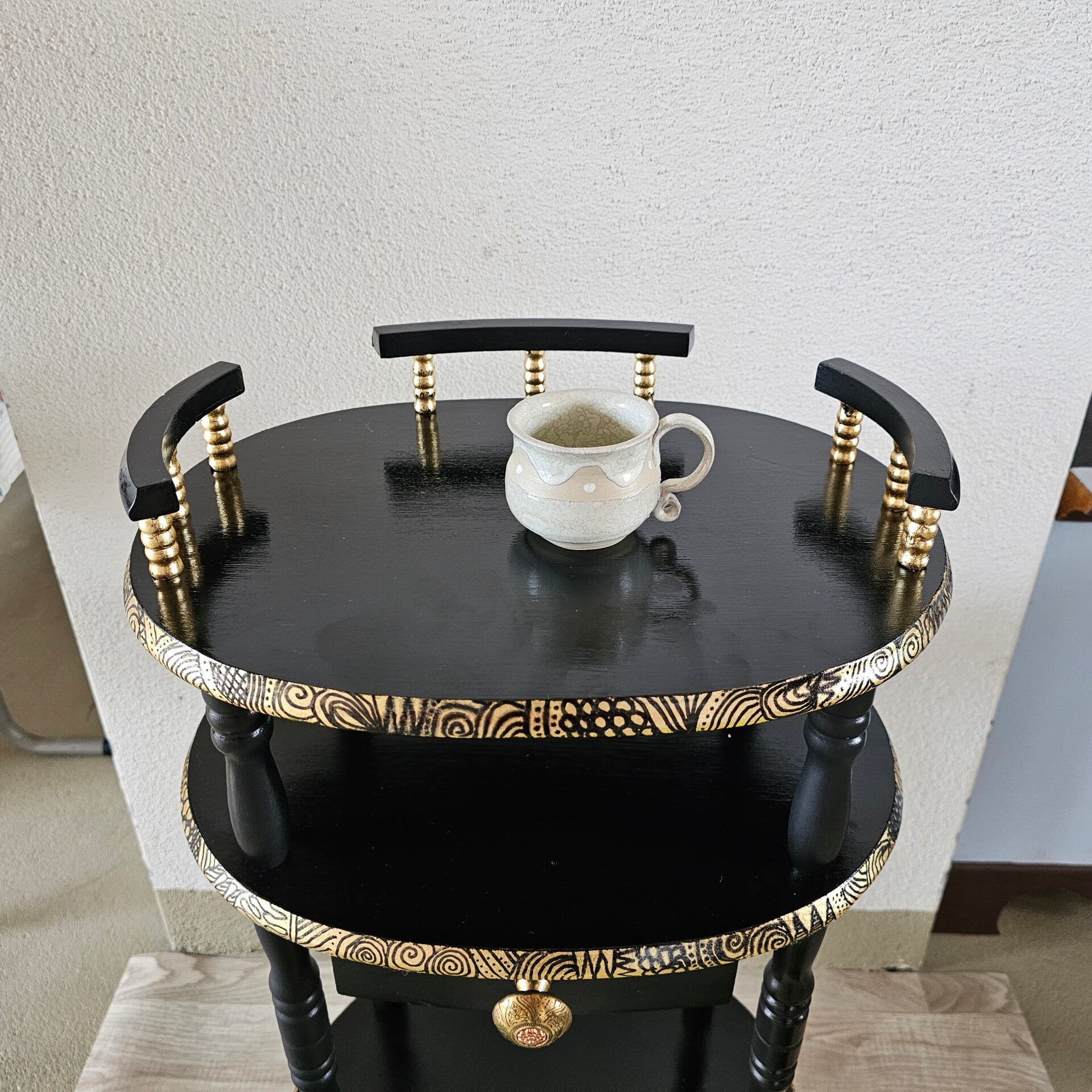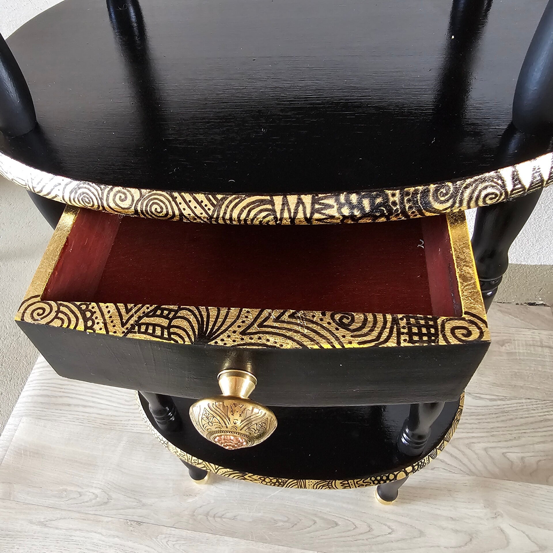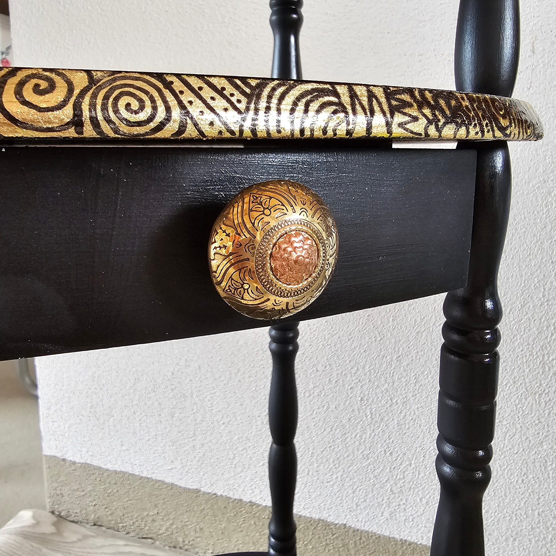 schwarz bemaltes Holzgestell, glänzend, Details mit Blattgold ausgearbeitet und feine Linienzeichnungen mit schwarz machen es einzigartig. Eine kleine Schublade mit passend ausgesuchten Möbelknopf.