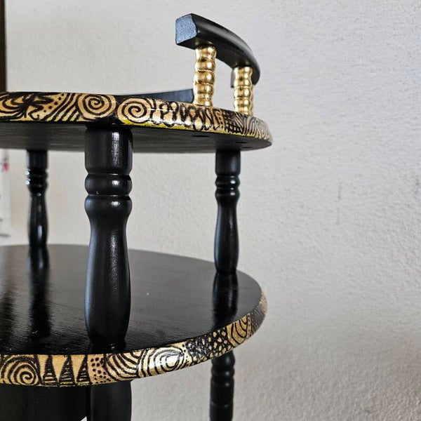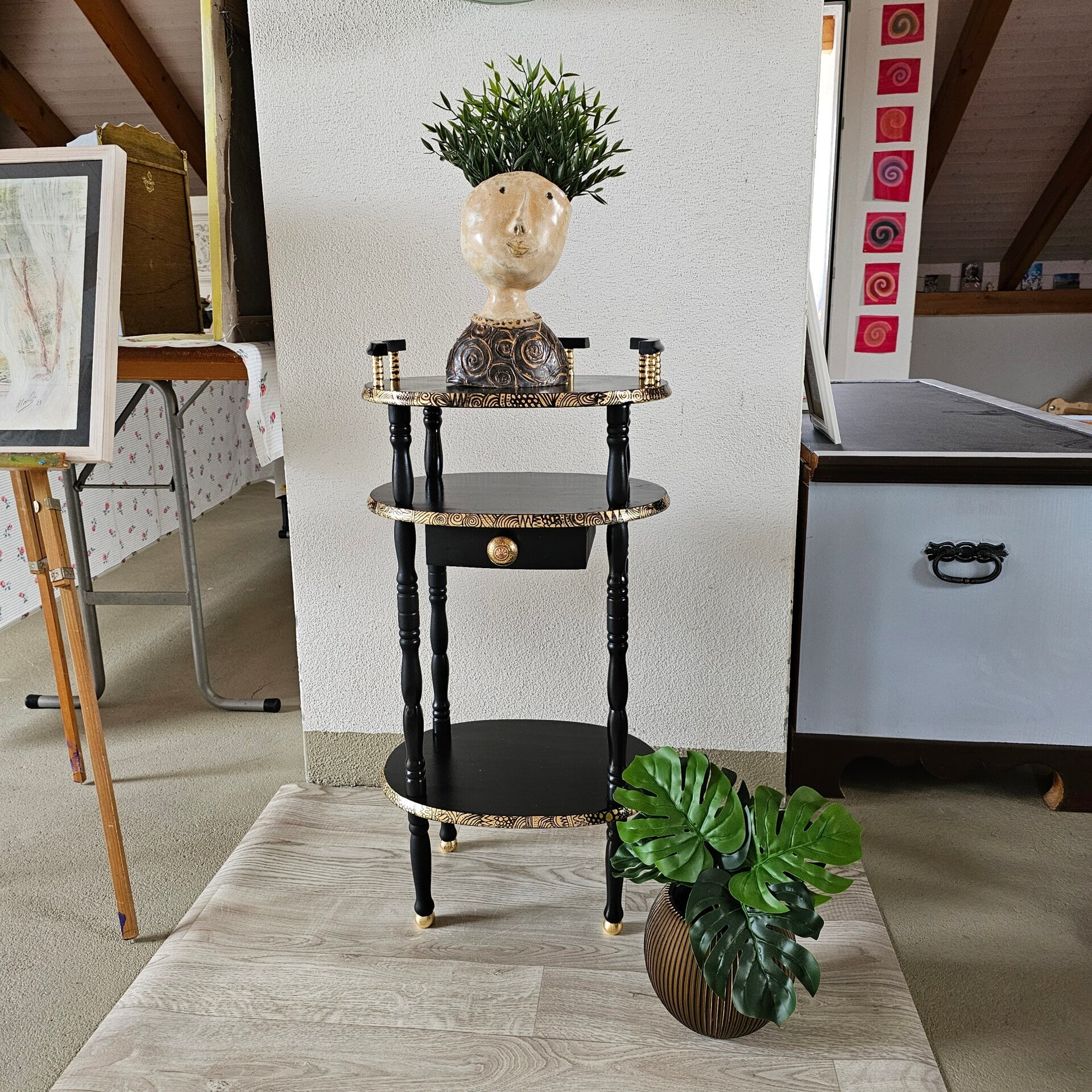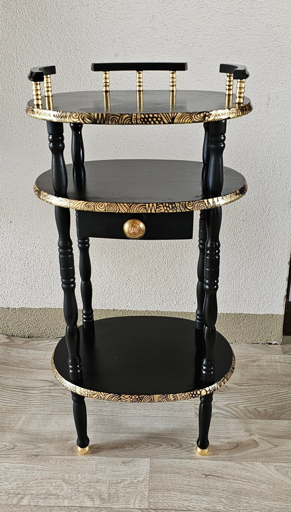 schwarz bemaltes Holzgestell, glänzend, Details mit Blattgold ausgearbeitet und feine Linienzeichnungen mit schwarz machen es einzigartig. Eine kleine Schublade mit passend ausgesuchten Möbelknopf.