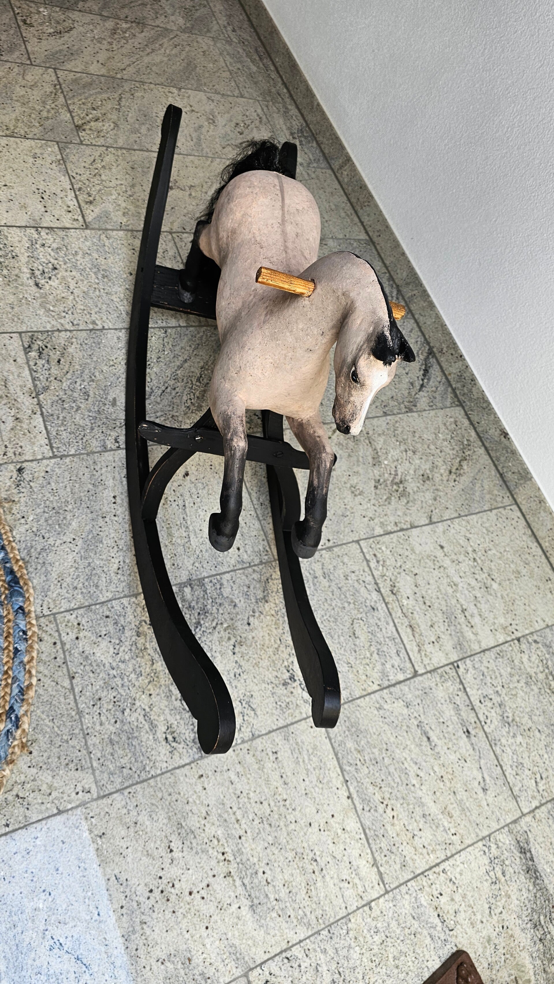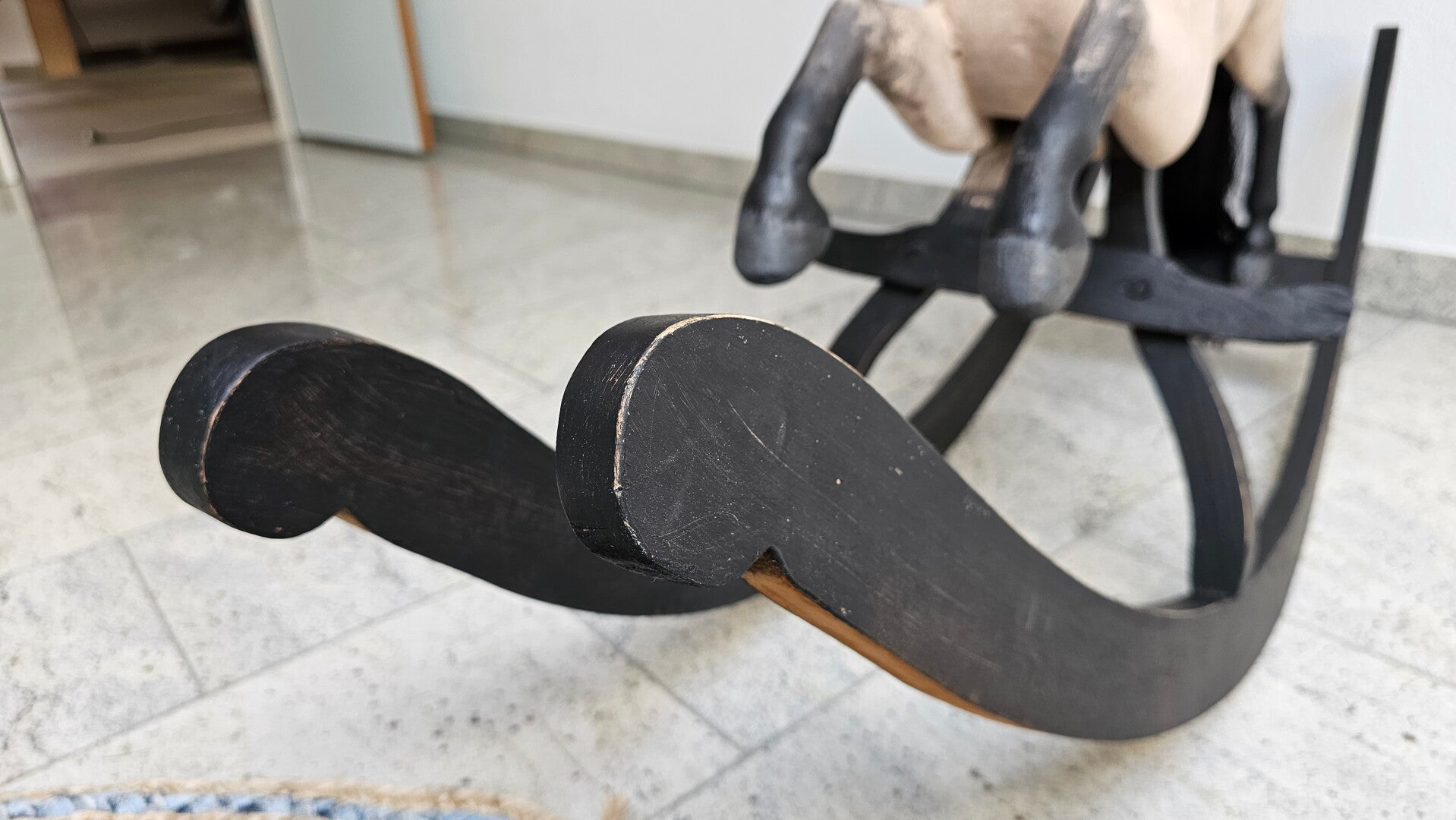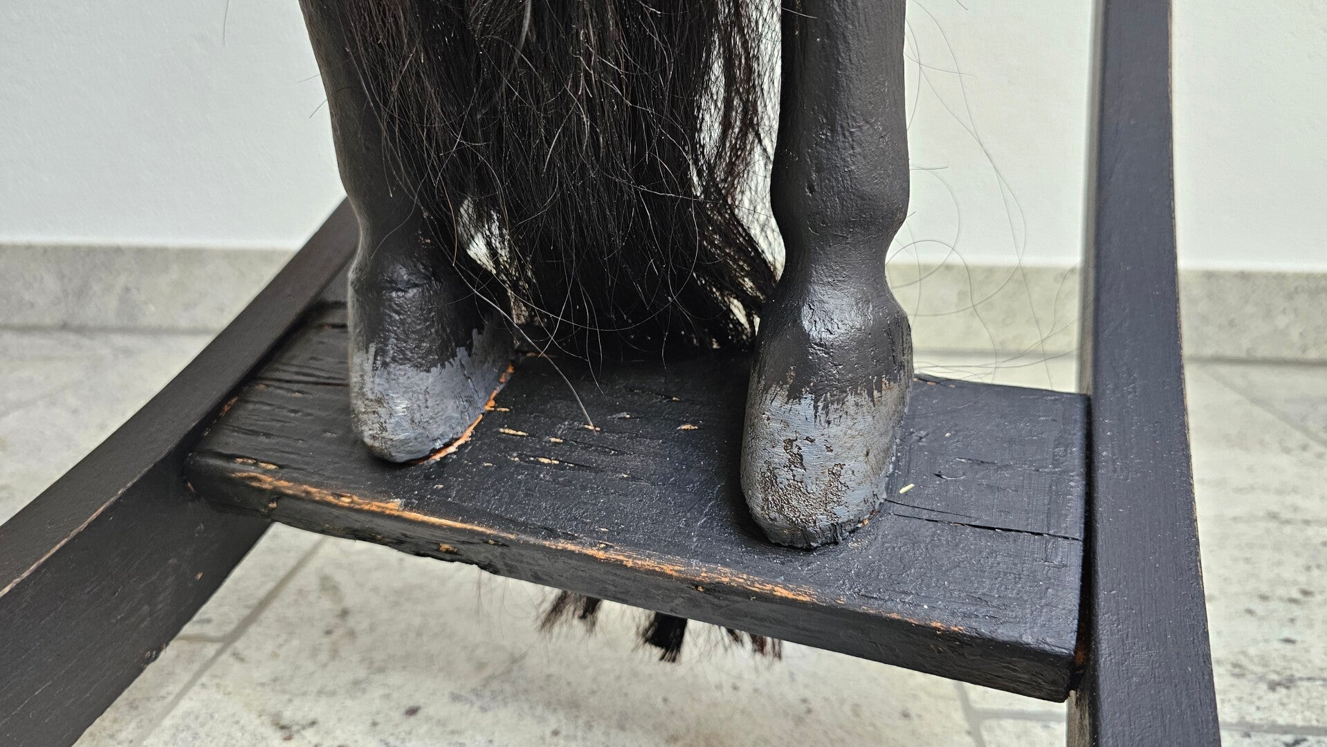 So sah das Schaukelpferd vorher aus, im Zürcher Oberland aus einem Schuppen abgekauft. Hier musste ich die halbe Nüstern rekonstruieren und einiges ausspachteln. Den Schweif habe ich von einem Shettlandpony das aufgrund eines Ekzems die ganzen Haare abschneiden musste, perfekte Länge für mein Schaukelpferdz ein secondhand Schweif. Natürlich ordentlich behandelt und gereinigt.