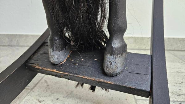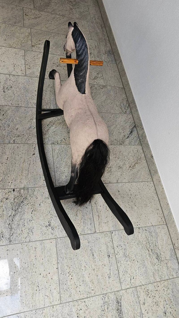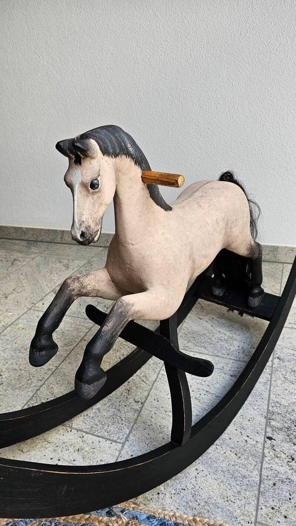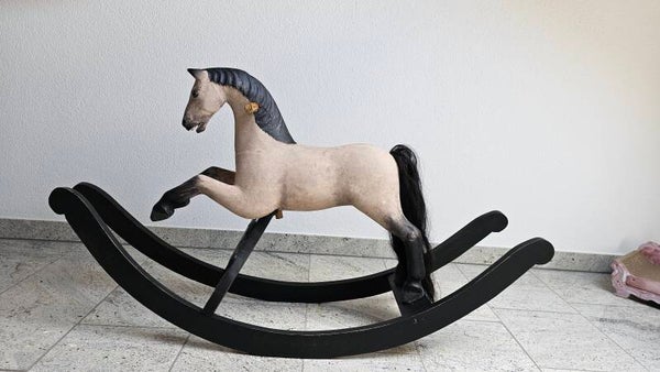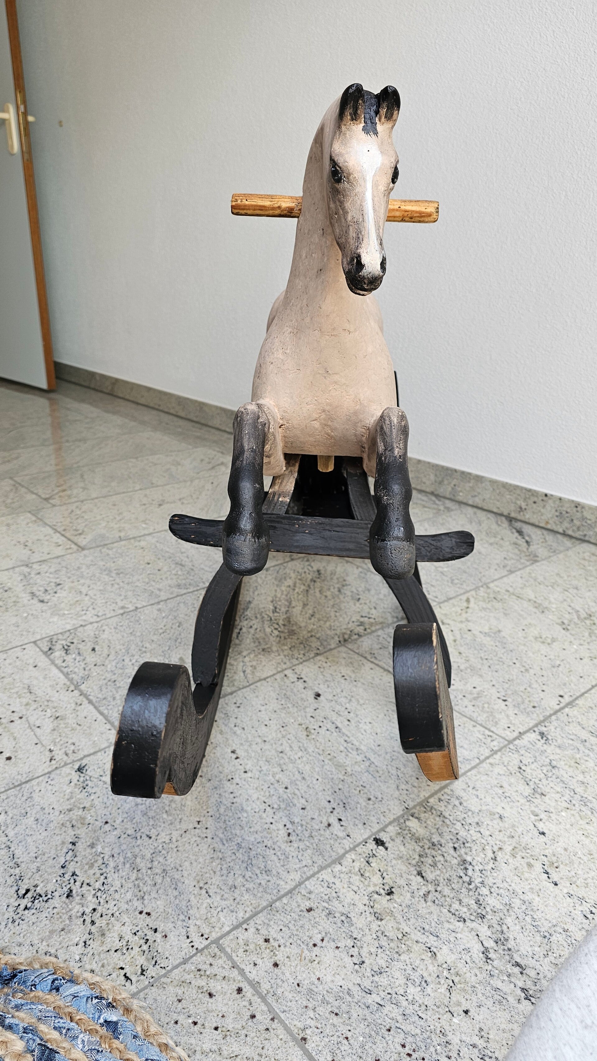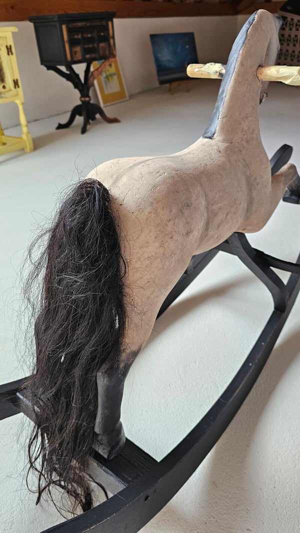 So sah das Schaukelpferd vorher aus, im Zürcher Oberland aus einem Schuppen abgekauft. Hier musste ich die halbe Nüstern rekonstruieren und einiges ausspachteln. Den Schweif habe ich von einem Shettlandpony das aufgrund eines Ekzems die ganzen Haare abschneiden musste, perfekte Länge für mein Schaukelpferdz ein secondhand Schweif. Natürlich ordentlich behandelt und gereinigt.