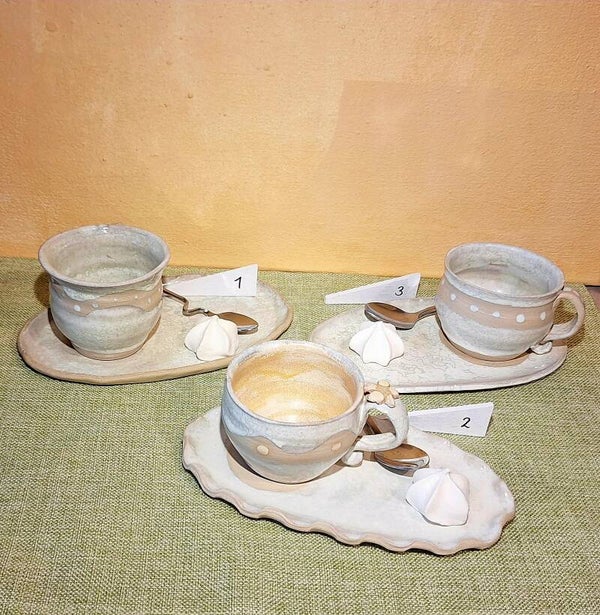 verschiedene Tassen creme- und naturfarben mit Unterteller rund oder länglich.